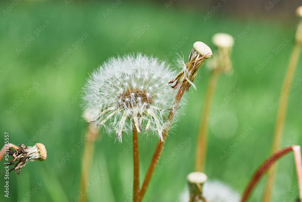 White dandelion flowers closeup. Closeup of white dandelion flower in grass with blurred background.