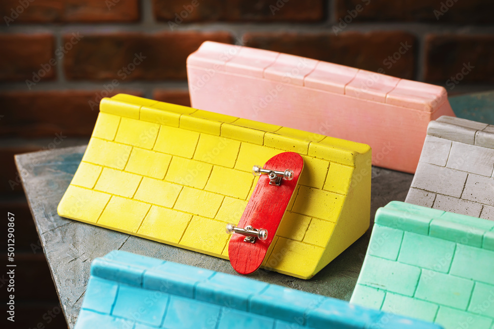 Multi-colored plaster ramps and fingerboard on the table, close-up