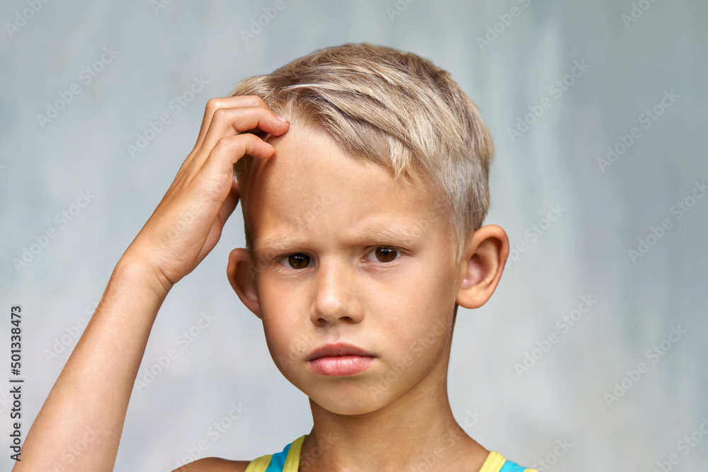Confused junior schooler puts hand on head looking in camera. Portrait of cute blond boy with brown eyes standing on white background closeup