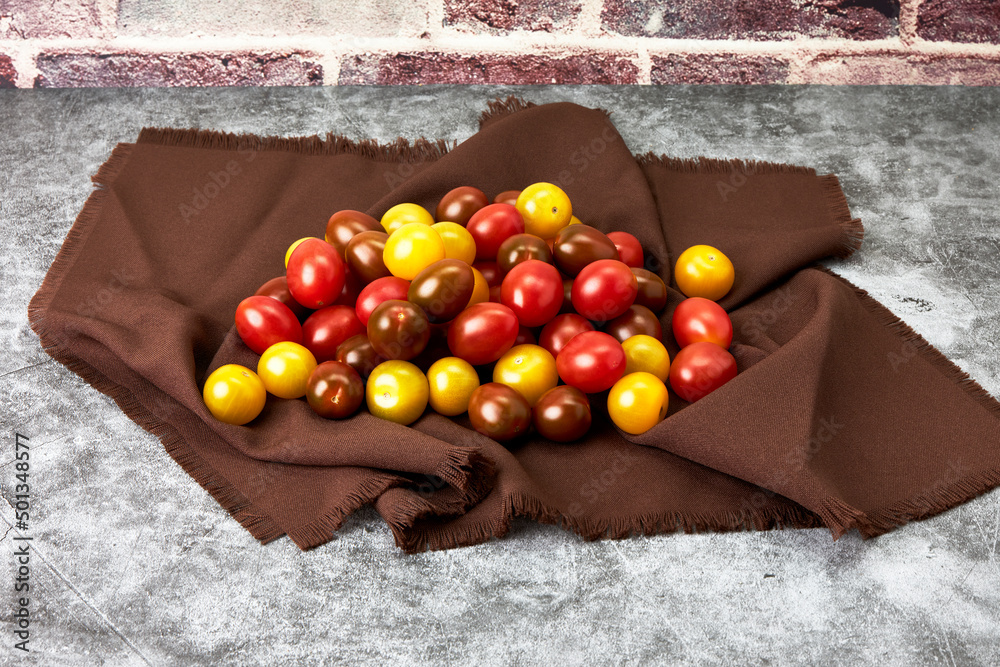 Cherry tomatoes of various colors on a brown cloth. Healthy food