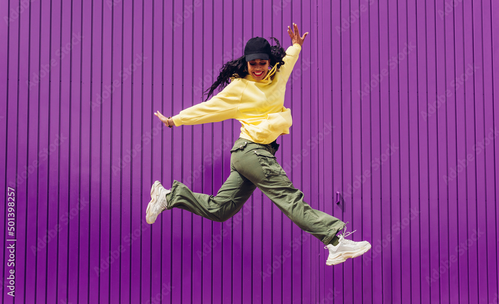 Jumping young woman in yellow dress on purple background. Dancer of hip hop and trap music. Concept of freedom, celebration, joy.
