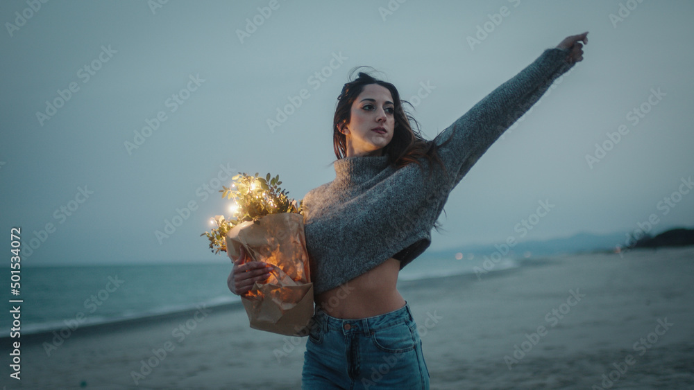 Happy young girl enjoys life on the beach with colorful lights on bag