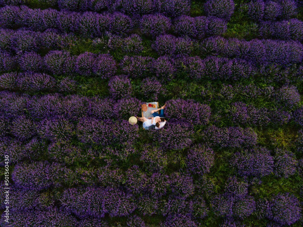Happy couple having romantic picnic at lavender field. Blooming, purple lavender field from top view. Drone photography.