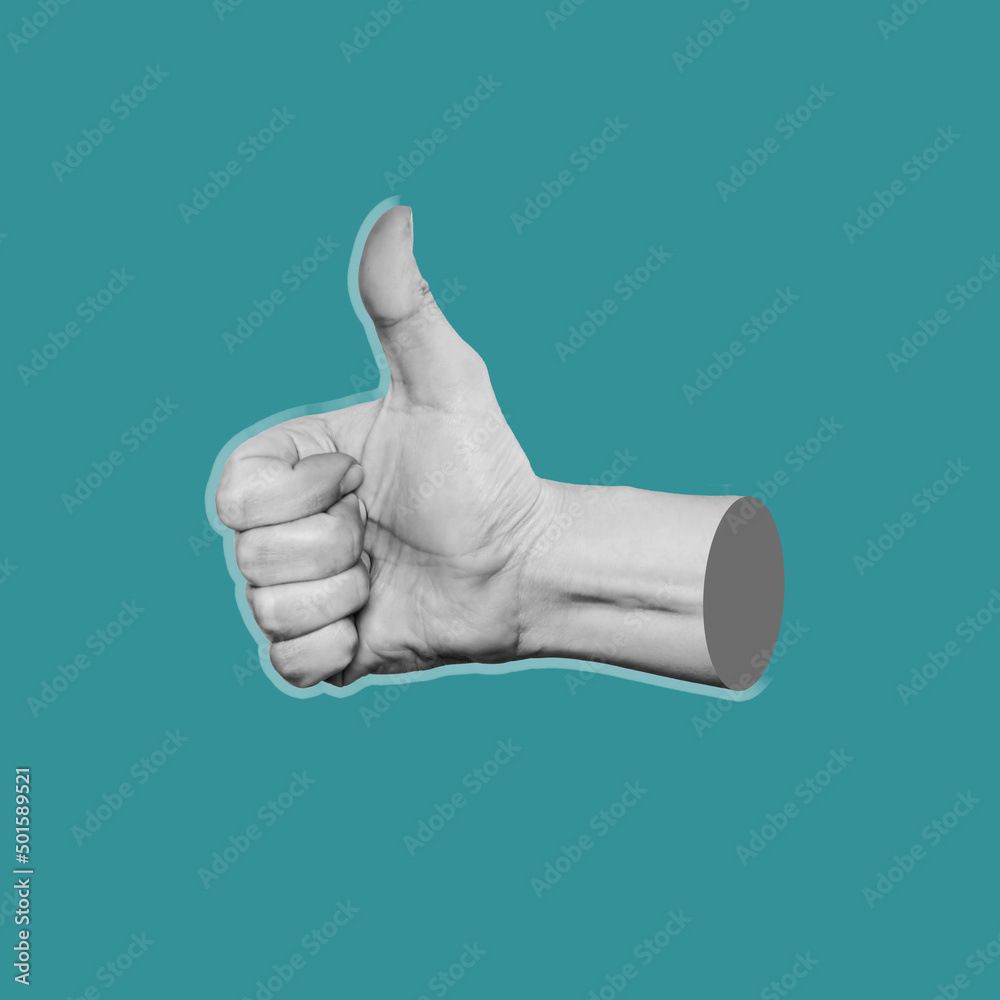 Female hand showing the thumb up gesture isolated a teal blue color background. Positive hand sign. Finger up. 3d trendy collage in magazine style. Contemporary art. Modern design