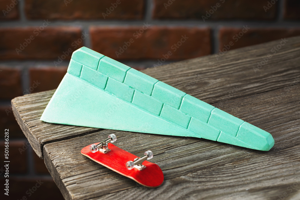 Red fingerboard and mint colored plaster ramp on a wooden table
