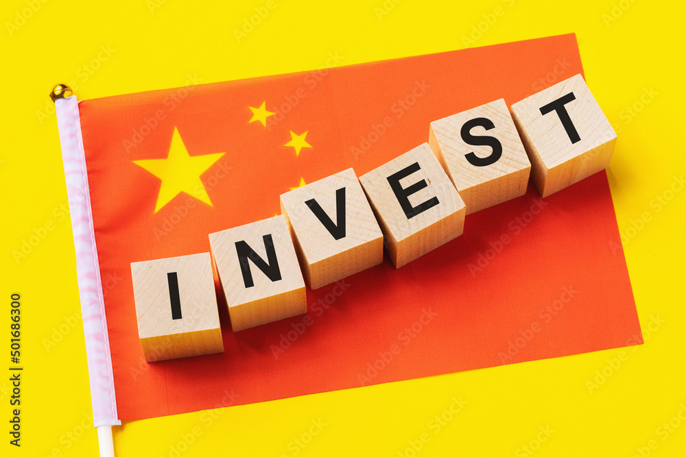 Wooden cubes with text and a flag on a colored background, the concept of investment from China