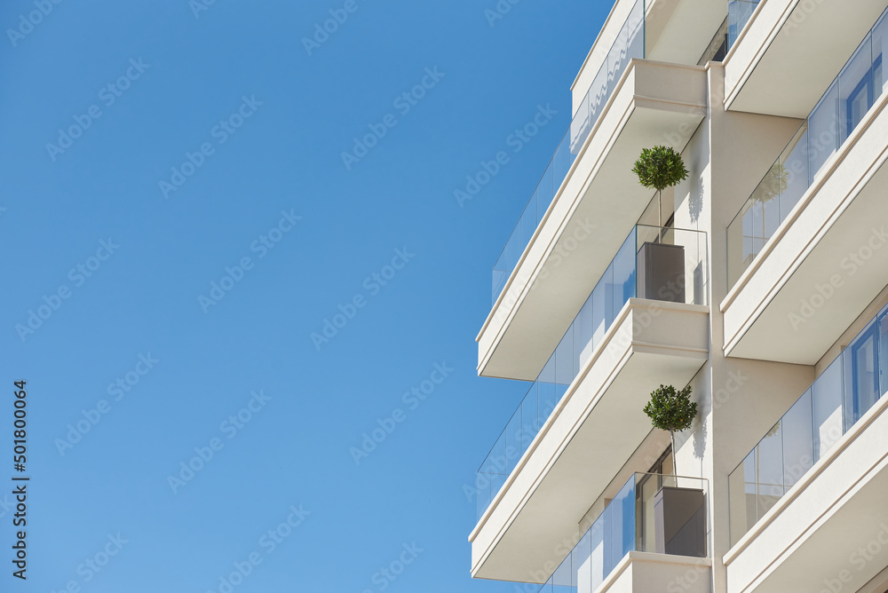 Balcony with glass railing in a modern apartment building against a blue sky with a copy space
