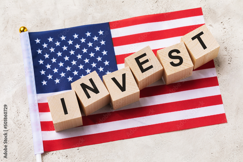 Wooden cubes with text and a flag on a abstract background, the concept of investment from America