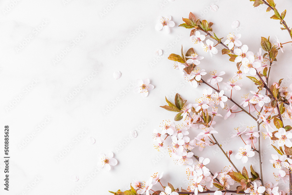 spring cherry blossom flowers on white background. top view. flat lay. spring concept