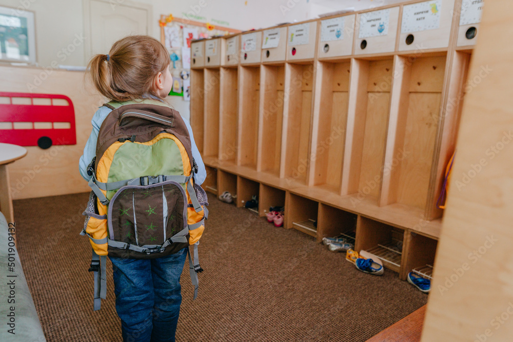 Back view of little girl with backpack going to school