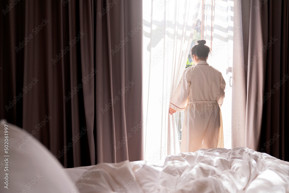 Young asian female woman stand open white curtains sheer at the window, the morning after waking up in the bedroom hotel. Woman wake up with a fresh and open the curtains on the windows.