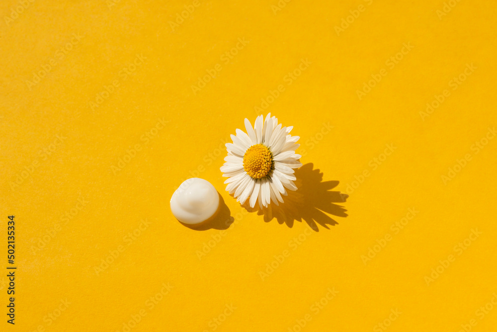 Chamomile bud with white petals with a drop of white cream isolated on yellow background. Flower in the center in sunlight with a beautiful shadow. Aromatherapy and herbal ingredients for cosmetics.