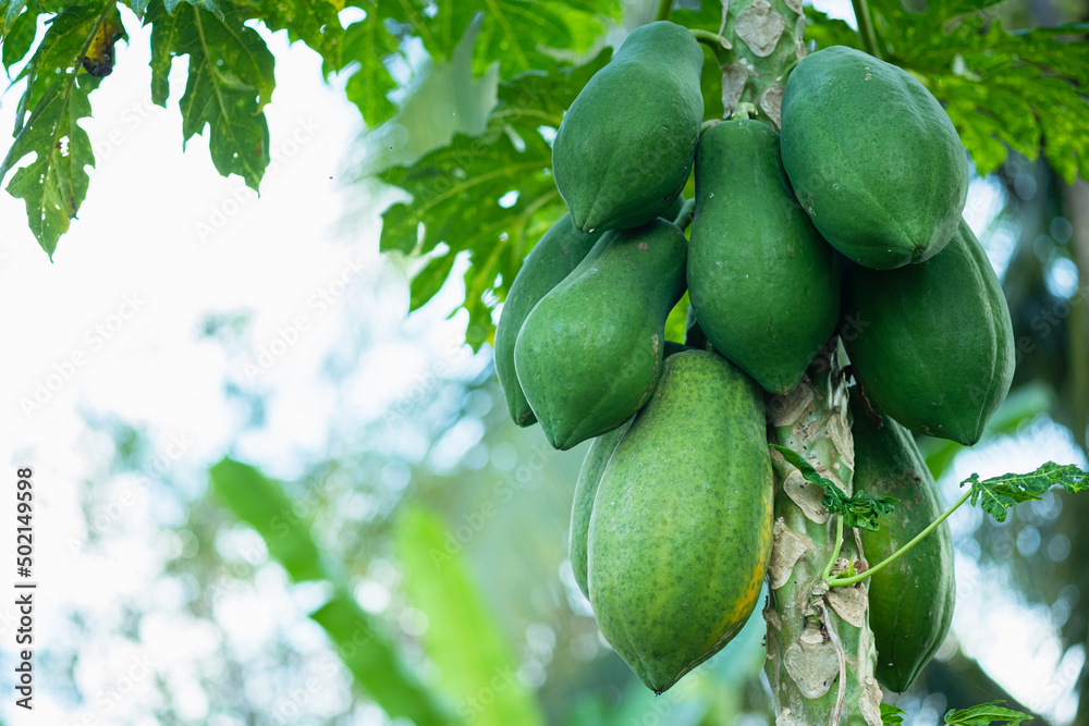 The unripe papaya fruit has a green color on the tree.Raw papaya and copy space.