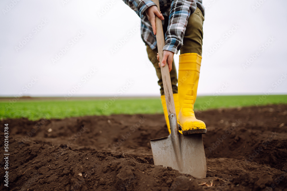 Woman wearing yellow boots digs soil with shovel. Agriculture, organic gardening, planting or ecology concept.