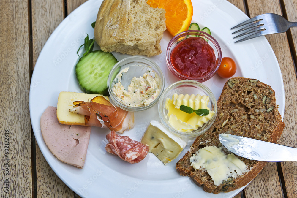Breakfast or lunch plate with various cold cuts, whole meal bred, jam and fruits on a wooden table in a street cafe, high angle view from above, selected focus