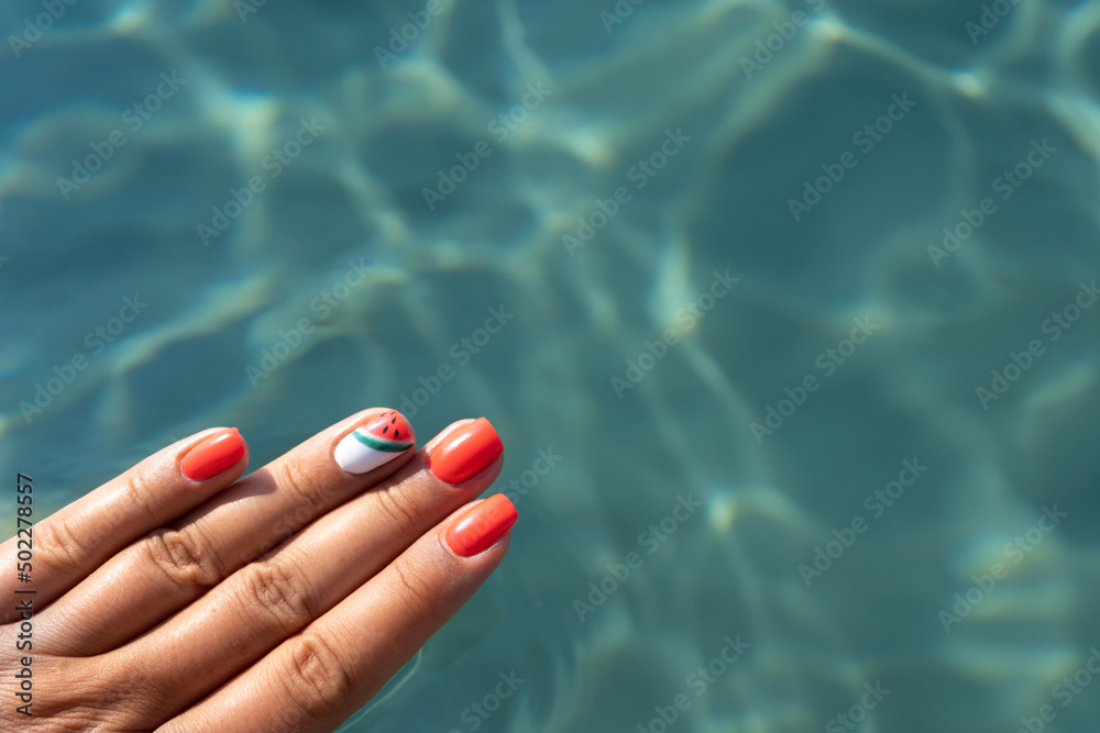 Woman hands with manicure with watermelon pattern on the background of a sea