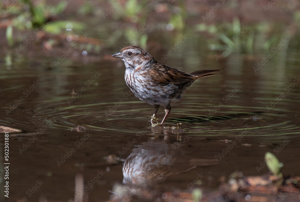 song sparrow bathing in water with a reflection