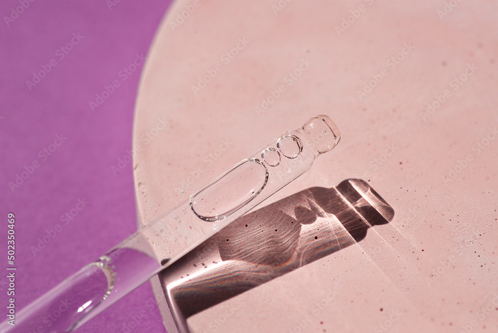 Pipette with serum or cosmetic liquid close-up on a purple background in soft focus. Beautiful shadow in the sunlight. Skincare products , natural cosmetic. Beauty concept for face and body care