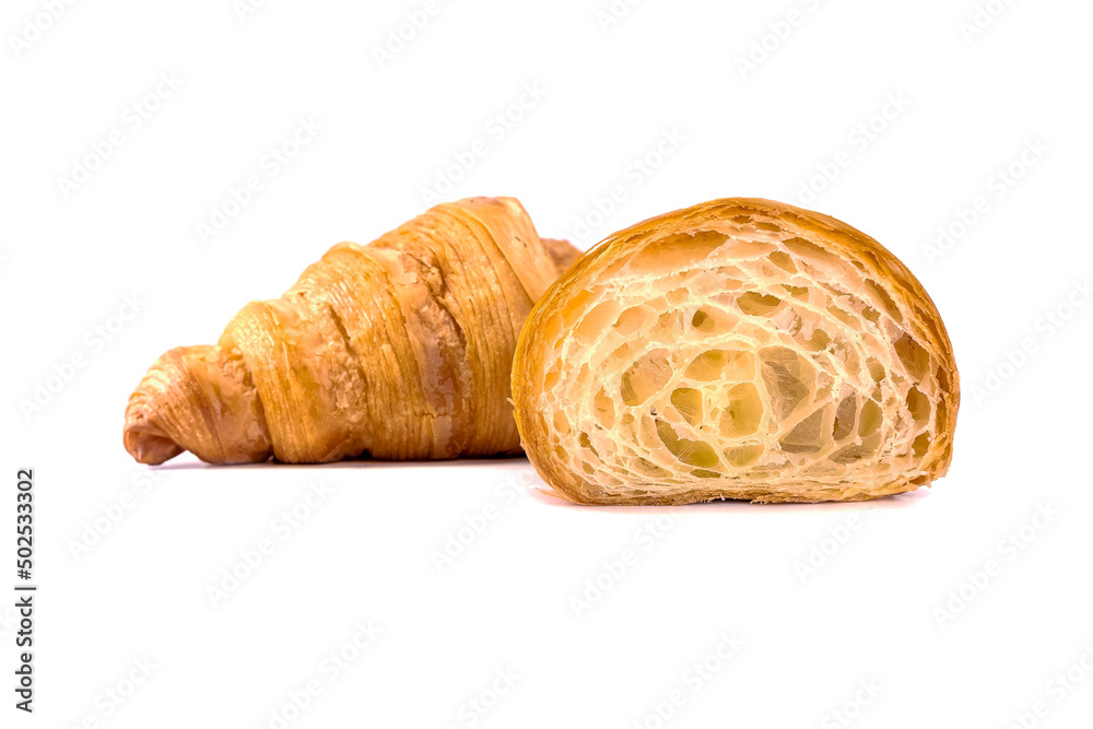 Plain Croissants and cut in half, showing the cross section, a classic crescent-shaped croissant. isolated on a white background.