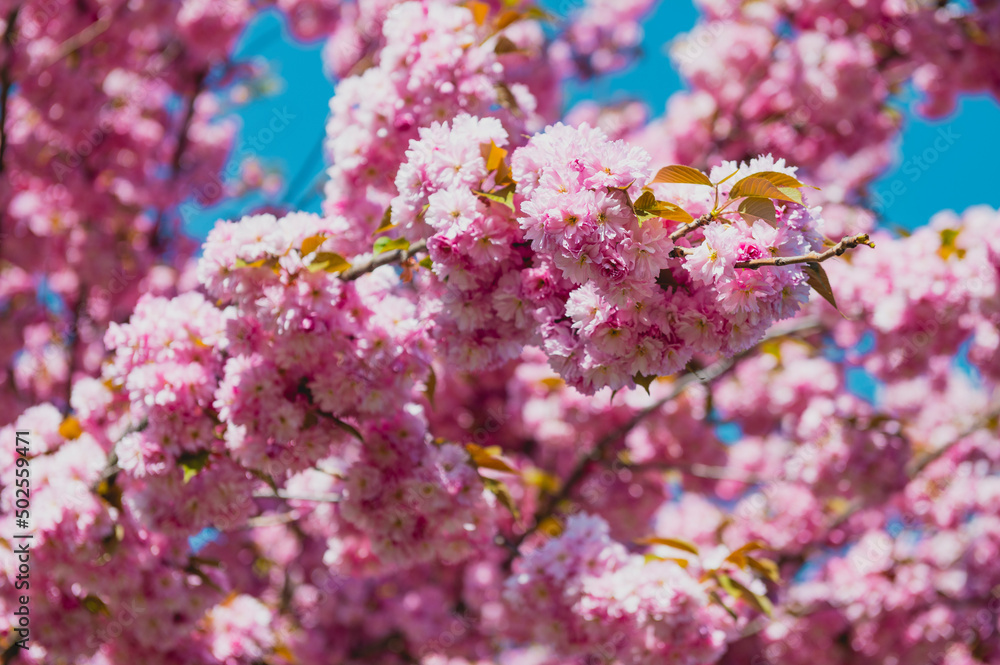 Beautiful colorful pink cherry blossom flowers in spring on a sunny summer day