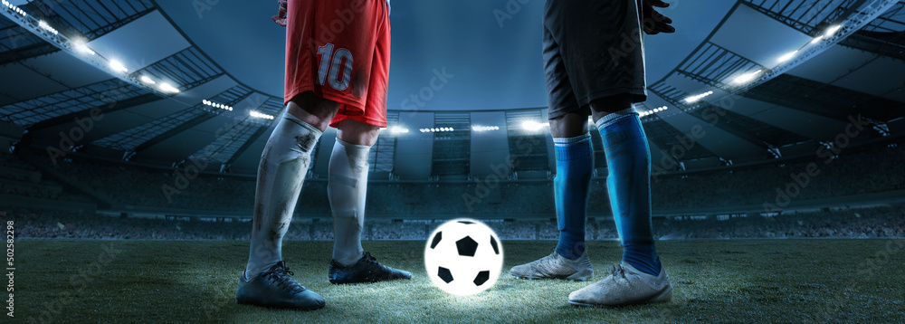 Night football match. Cropped image of two soccer, football players standing near luminous ball at stadium in evening. Concept of sport, competition, goals