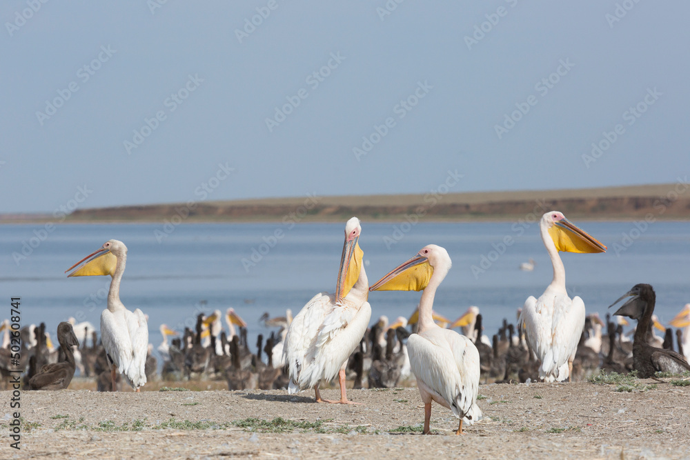 Pink pelicans on the shore of Lake Manich-Gudilo in Kalmykia, Russia