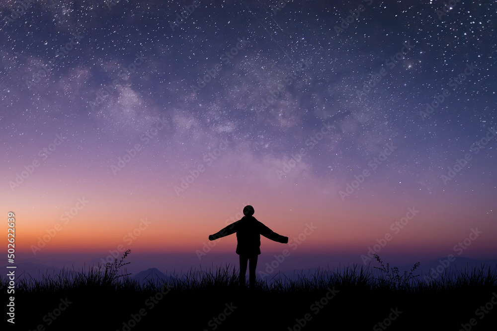 Silhouette of young traveler and backpacker standing and open arm watched the star and milky way alone on meadow with sunlight at twilight time.