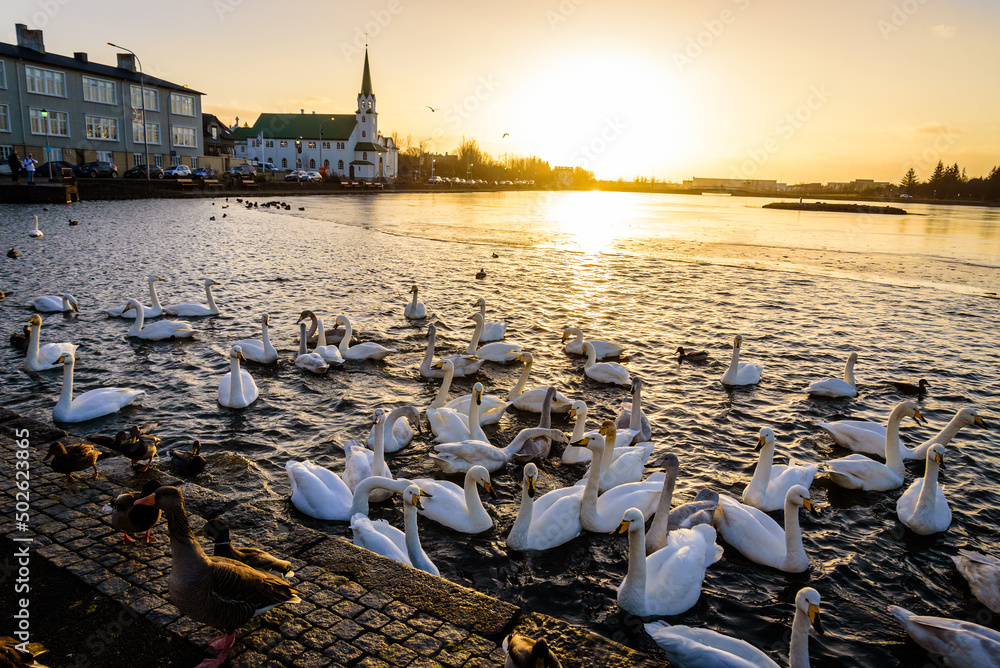 Whooper Swan and ducks in the frozen pond Tjornin in Reykjavik, Iceland with the sunset in the background.