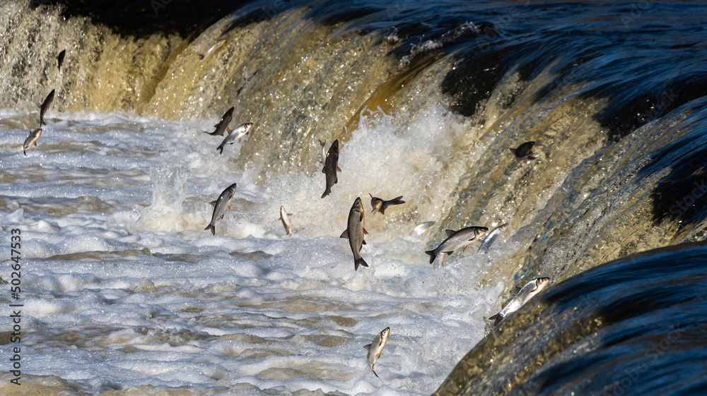 Fishes go for spawning upstream. Vimba jumps over waterfall on the Venta River. Kuldiga, Latvia.