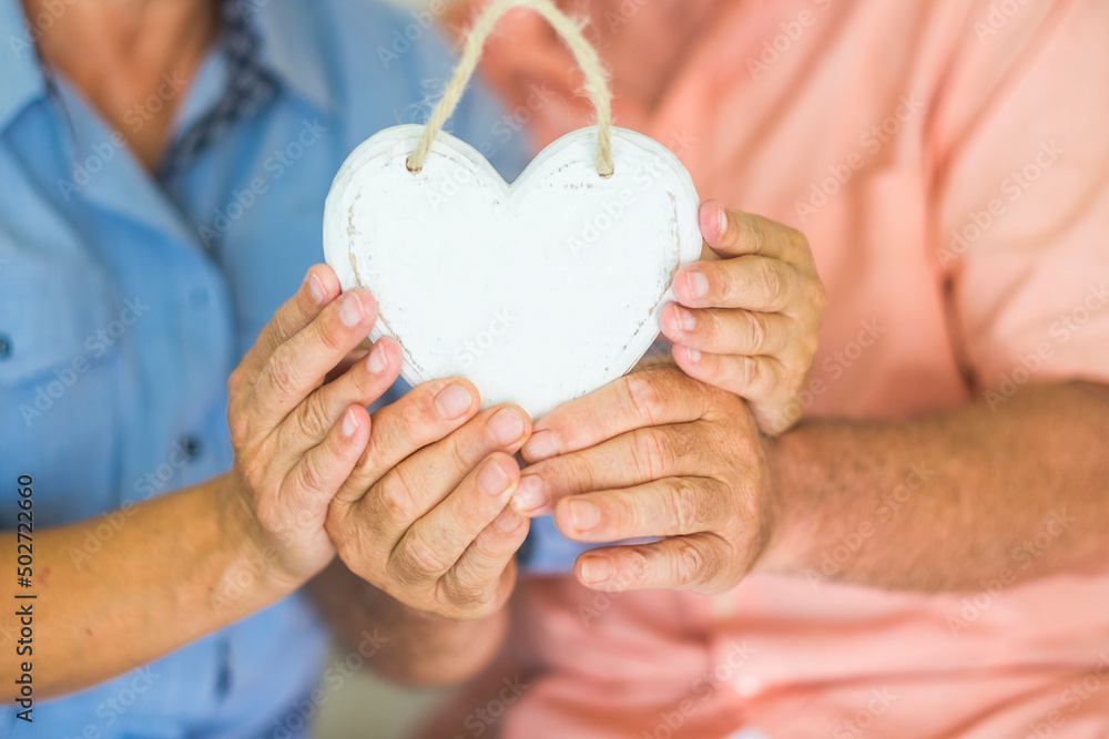 Close up of couple old hands holding white wooden heart to represent love and relationship. Heart attack prevention day life concept. Healthy unrecognizable mature man and woman