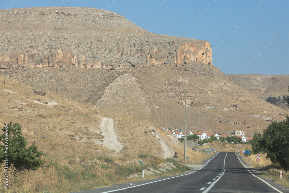 Desert highway and ancient dwellings in caves in the rocks at sunset on Kayseri province, Turkey, Asia