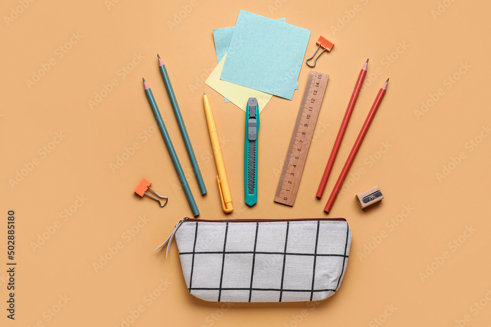 Checkered pencil case with stationery supplies on beige background
