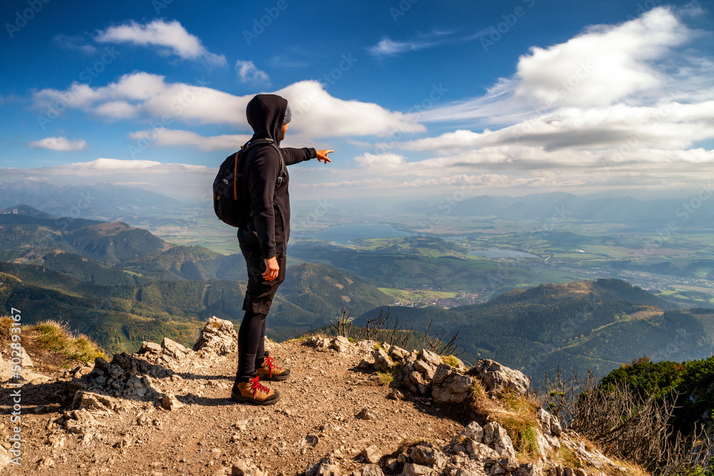 Hiker on top of the hill Velky Choc showing on beautiful mountain landscape in Slovakia