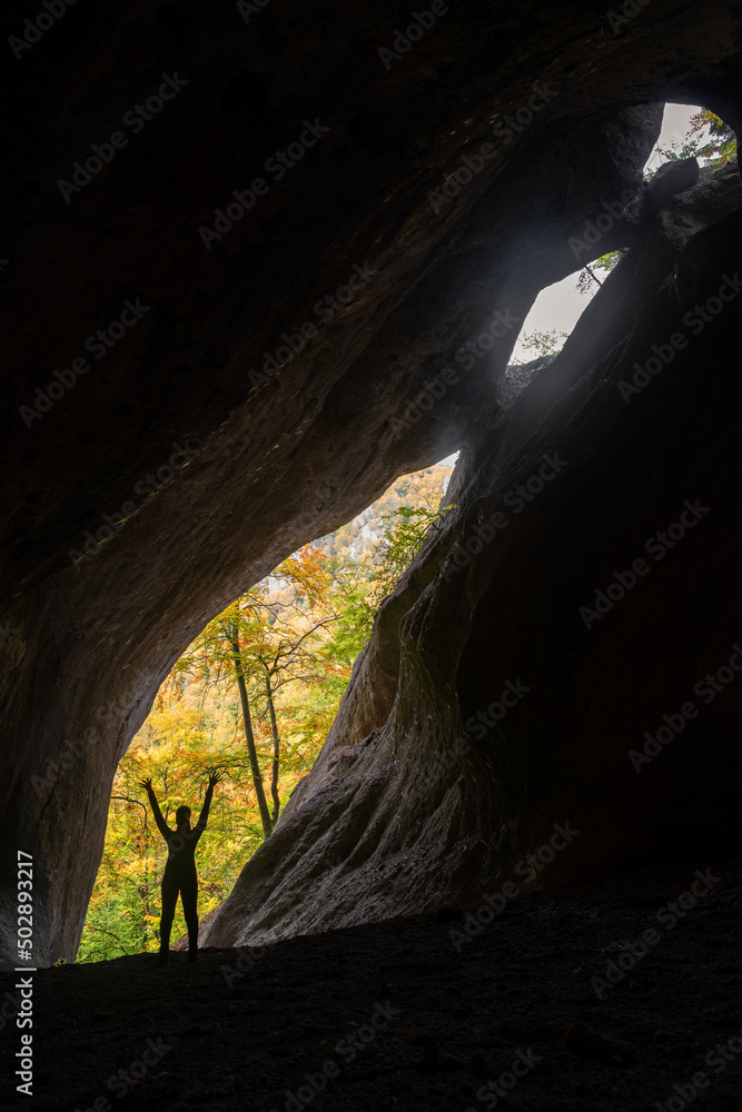 Silhouette of tourist inside cave called Dragon hole in Sulov rocks at Slovakia