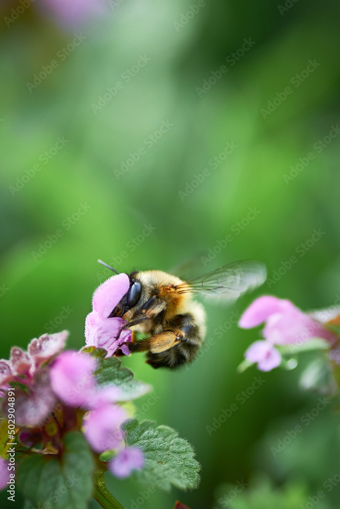 Bee on pink flower. Closeup of bee taking pollen from pink flower in meadow.