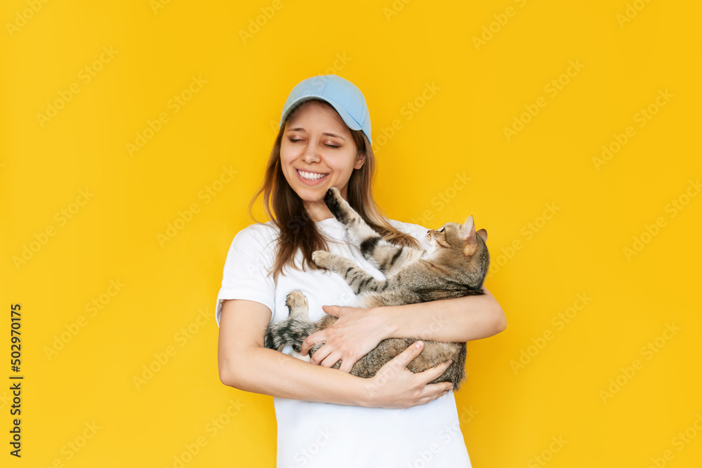A young caucasian blonde woman in a white t-shirt and blue cap holds a tabby cat in her hands isolated on a color yellow background. The cat touches the girl's face with her paw scratching it