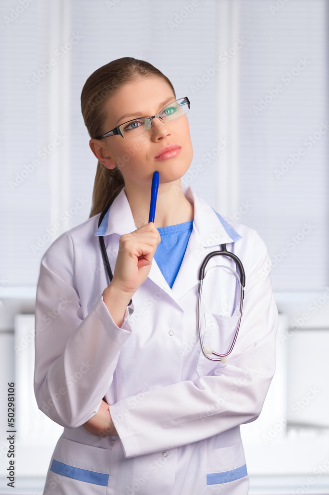 Portrait of Thinking Woman Doctor Wearing Stethoscope
