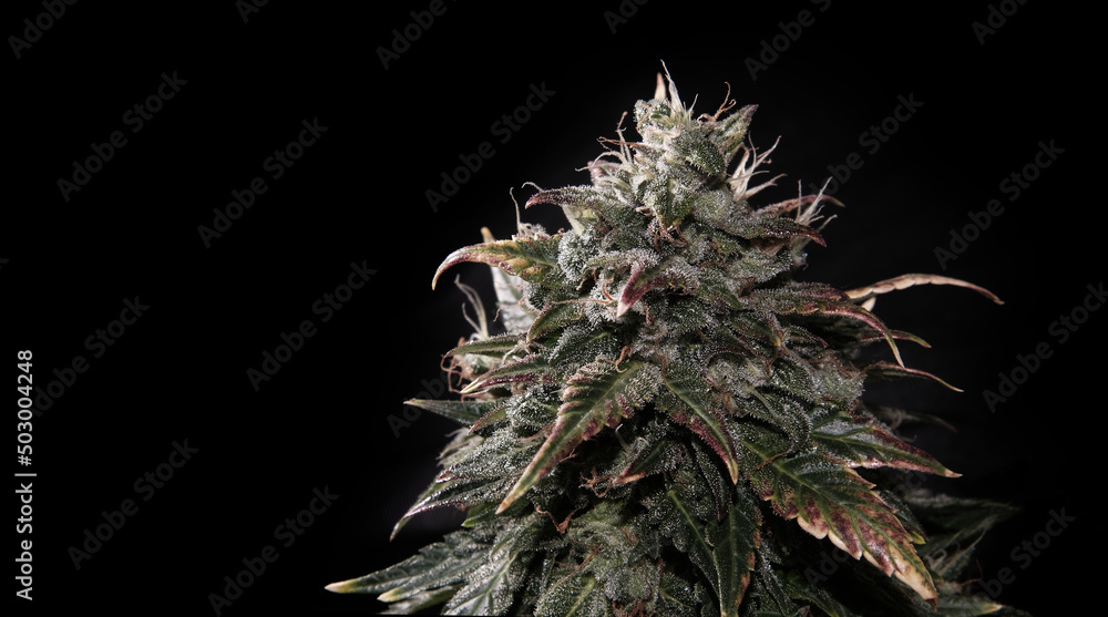 Blooming cannabis bud with glandular trichomes and brown stigmas. Fresh CBD marijuana plant isolated on black background. Herbal medicine layout. Hemp recreation, micro growing concept.