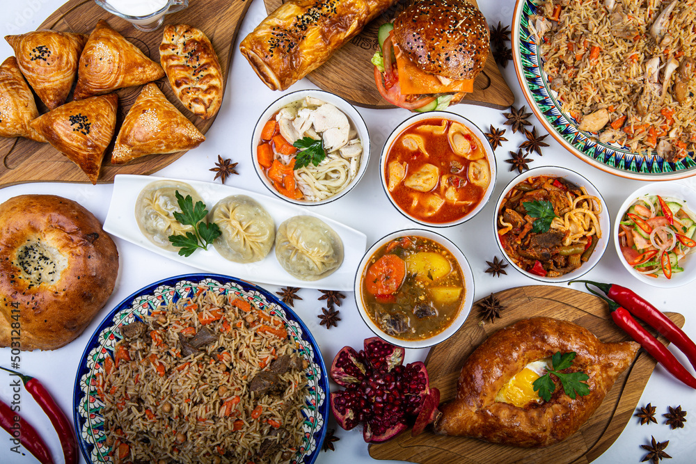 The concept of oriental cuisine. Assorted Uzbek food set, pilaf, samsa, lagman, manta, shurpa central asia food. Homemade Uzbek pilaf or plov from lamb served in cast iron cookware