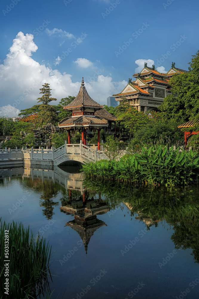 Shunfengshan Park, located at the foot of Taiping Mountain in Shunde District, Foshan City, Guangdong, China. A paifang is a traditional style of Chinese architectural arch or gateway structure.