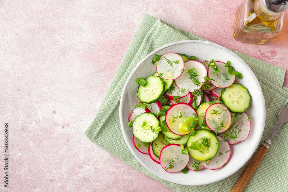 Radish salad with cucumber, dill, onion and olive oil in a plate with fork on pink concrete background. Top view