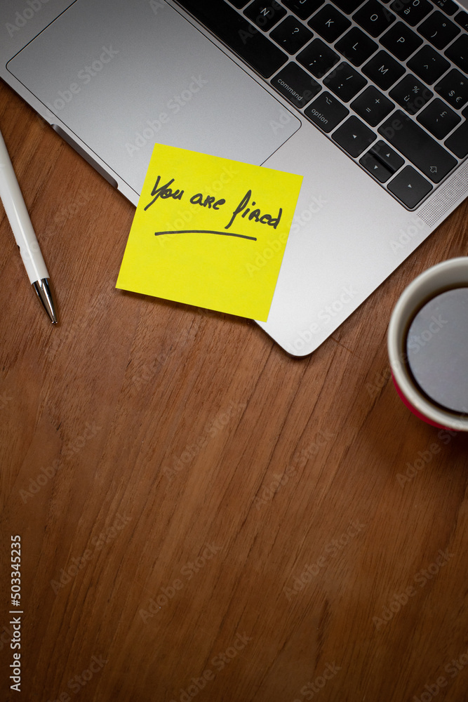 Symbole de la crise économique et de la crise de l'emploi. Une note est collée sur un ordinateur avec ce message : tu est viré