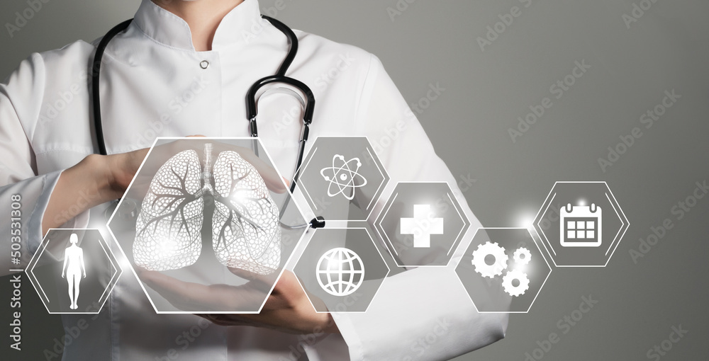 Unrecognizable female doctor holding graphic virtual visualization model of Lungs organ in hands. Multiple medical icons on the background.