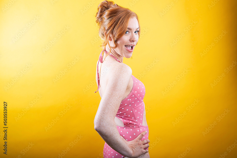 Portrait of woman with red hair and freckles wearing pink polka dot swimsuit. Seamless yellow background