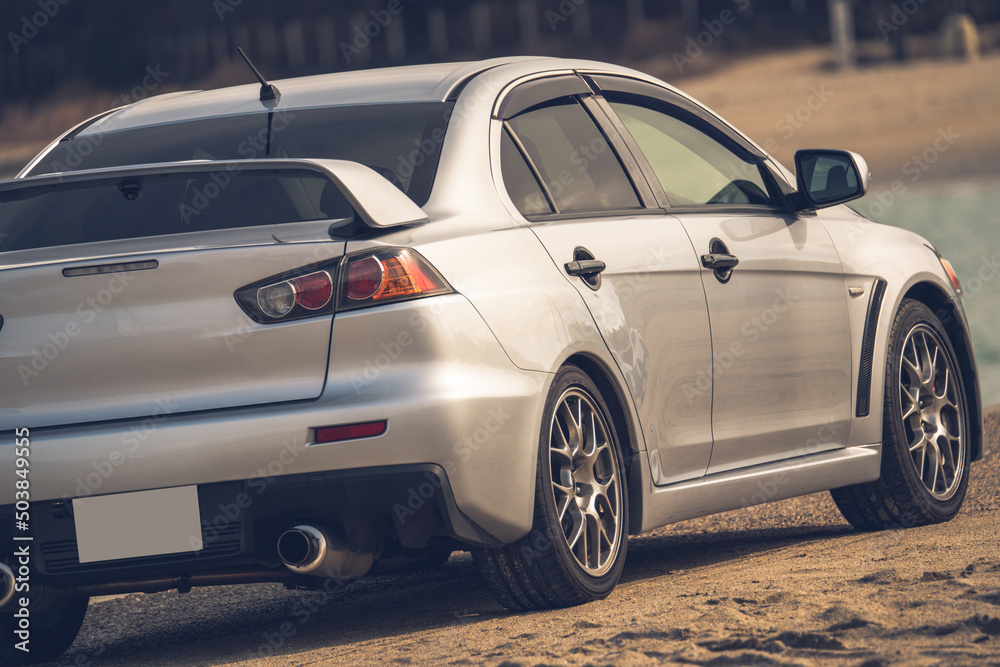 セダン スポーツカー シルバー 車 国産車 ドライブ 夕焼け 海 海岸 ビーチ