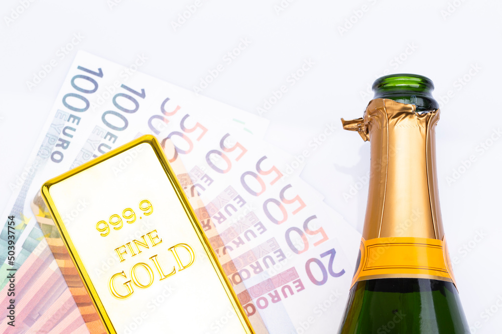 The photo shows the top of a champagne bottle isolated on white background with banknotes and a gold brick