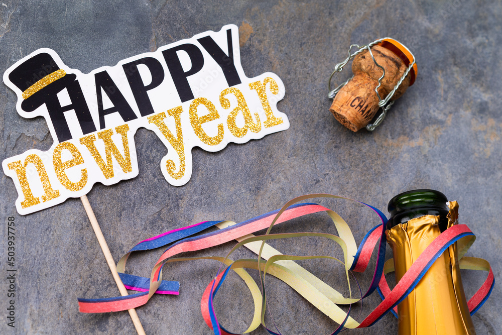 The photo shows the head of an opened champagne bottle with cork on gray background and a sign