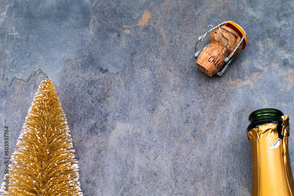 The photo shows the head of an opened champagne bottle with cork on gray background