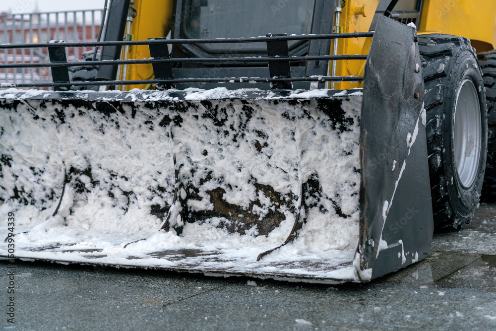 Snow plow tractor with a bucket in the snow remnants in the parking lot. Close up.