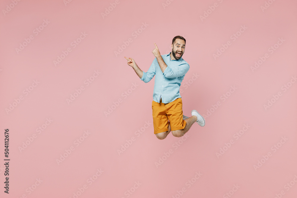 Full body young excited fun man 20s wear classic blue shirt jump high point index finger aside on workspace area mock up isolated on plain pastel light pink background studio People lifestyle concept